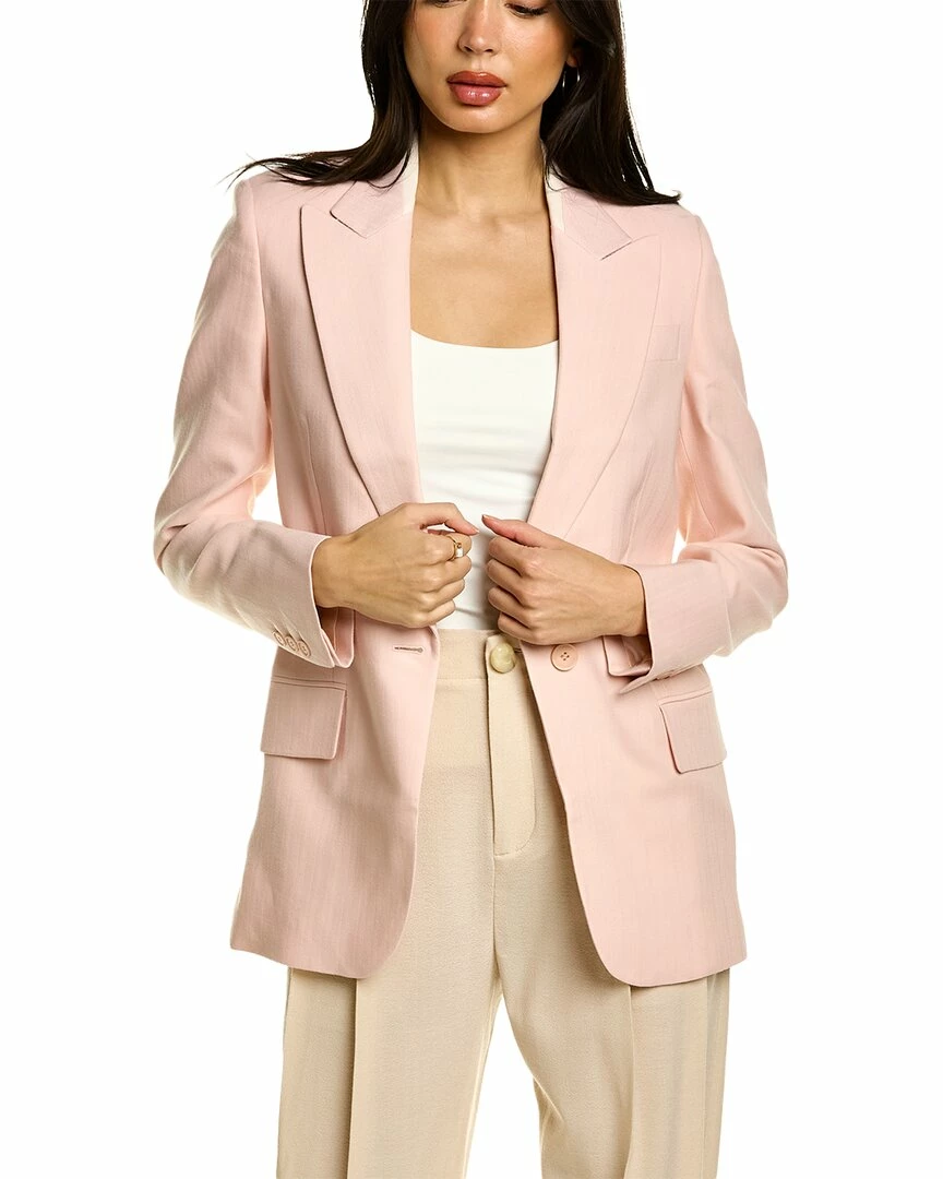 - Bella Wool-Blend Jacket In Pink With Peak Lapel, Left Chest Pocket, Dual Front Pockets, Button Cuffs, Belted Waist, And Vented Back Hem