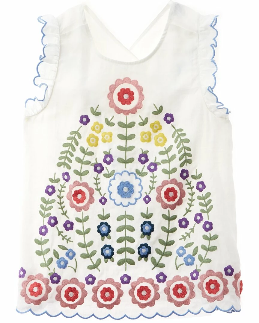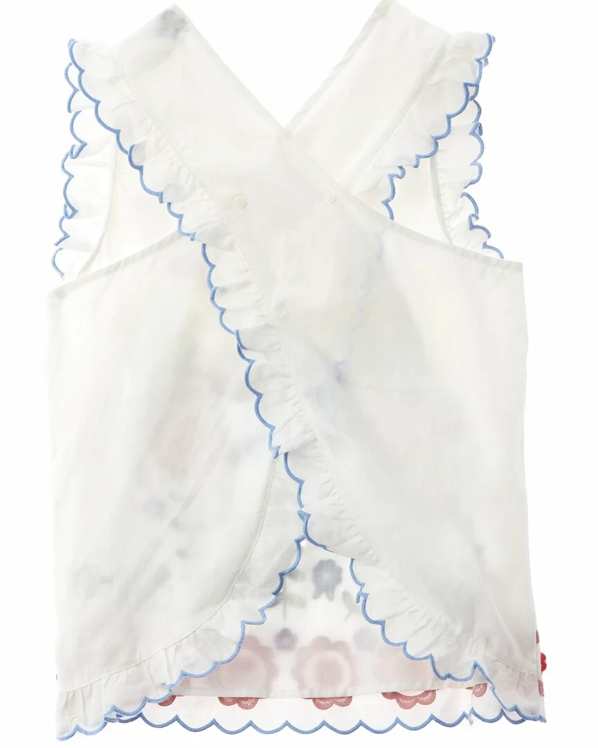- Embroidered Top In White Multicolor With Embroidered Design, Scalloped Ruffle Trim And Crossover Back