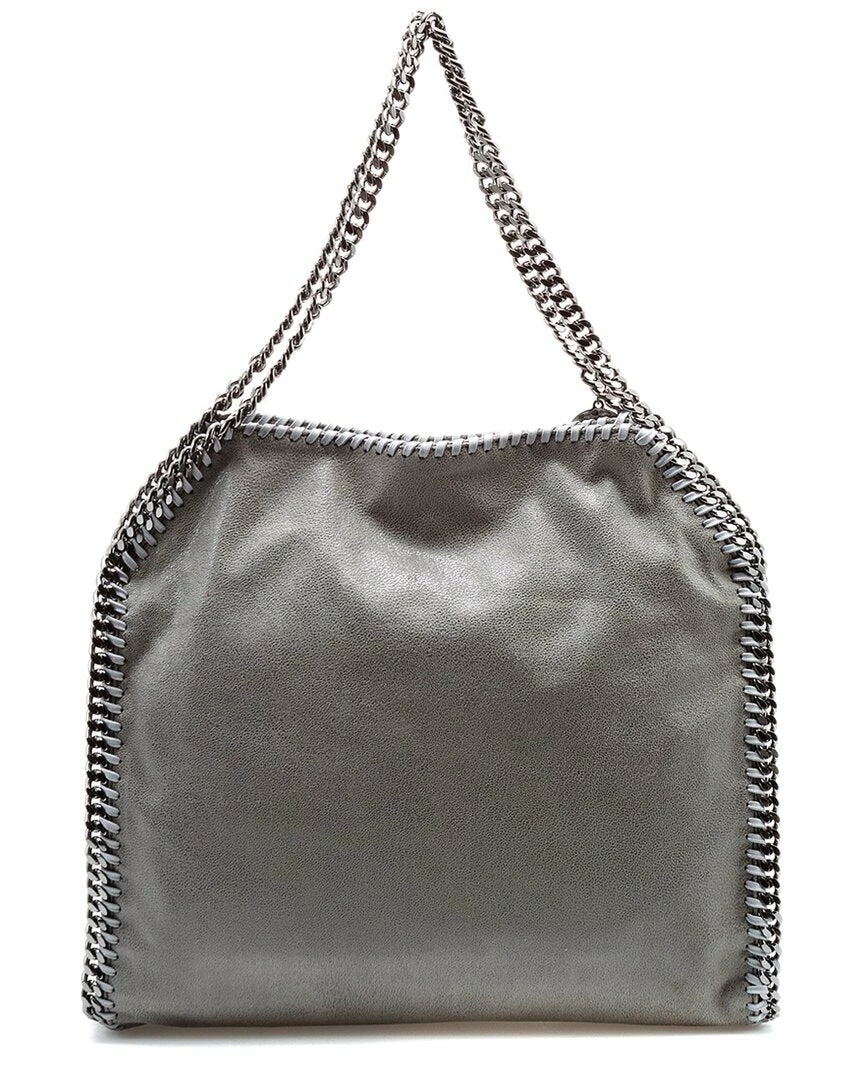- Light Grey Vegan Friendly Faux Leather Tote With Gunmetal Chain Link Trim And Circular Brand Name Charm