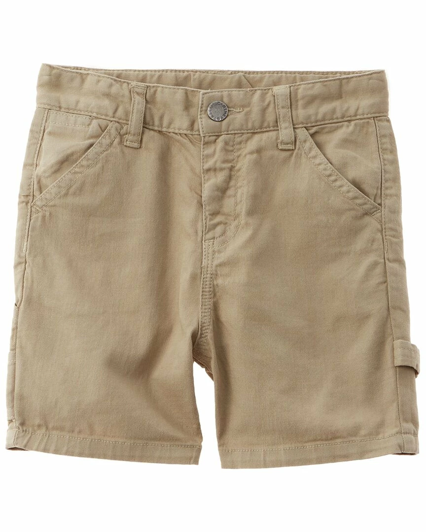- Five-Pocket Short In Khaki With Adjustable Waist, Belt Loops, Strap Accent And Classic Five-Pocket Styling