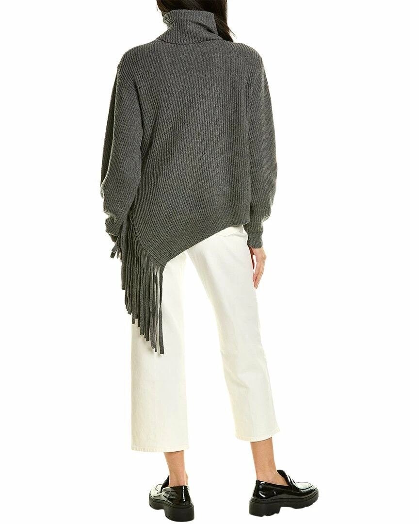 - Fringed Ribs Cashmere & Wool-Blend Jumper In Grey With Turtleneck, Dropped-Shoulder Blouson Sleeves, And Asymmetric Fringe-Trim Hem