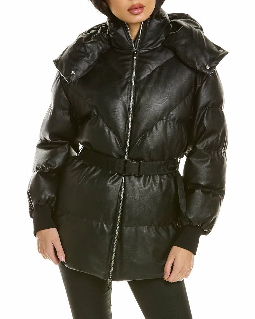 - Kayla Coat In Black With Quilted Faux Leather Construction, Stand Collar, Hooded Back, Logo Taping Belt At Waist, Dual Side Seam Pockets And Ribbed Cuffs