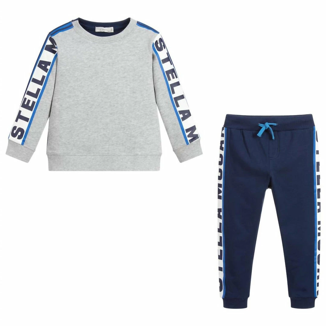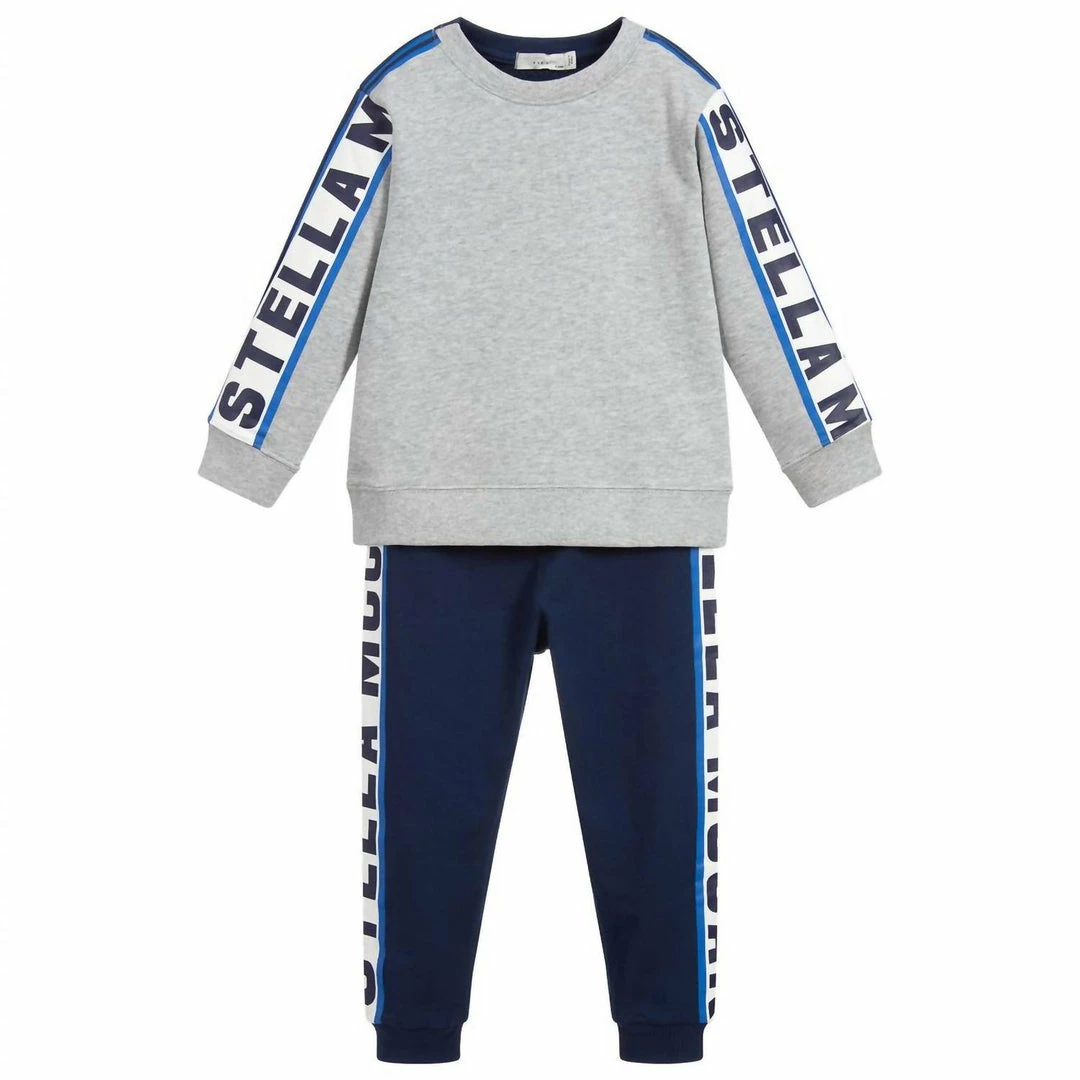 Boys Navy Blue And Grey Tracksuit By Stella Mccartney Kids Made In Midweight Cotton Jersey The Sweatshirt Has The Brands Logo Printed Down Both Arms The Joggers Have An Elasticated