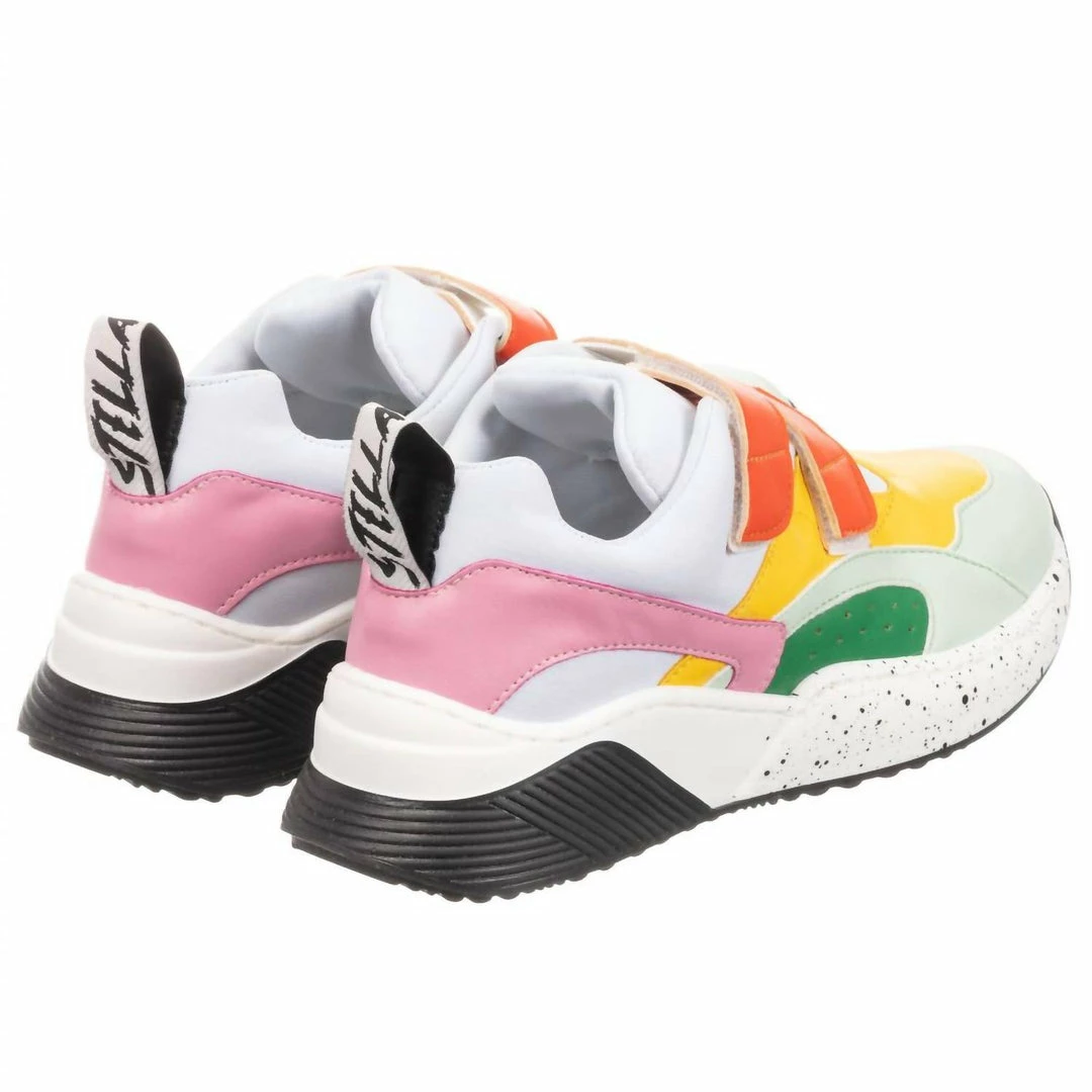 Stella Mccartney Kids Colorful Trainers For Girls With Velcro Fastenings Made In A Combination Of Faux Leather And Smooth Fabric With Orange Yellow And Pink Trims Lined In A Smooth Fabric With A Comfortable Padded Insole They Have Black And White Thermoplastic Rubber Outsole