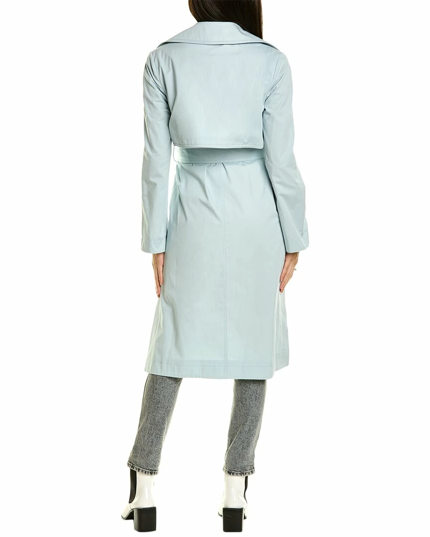 - Melinda Trench Coat In Blue With Notch Collar, Storm Flaps, Dual Front Pockets, Belted Waist, And Vented Sides